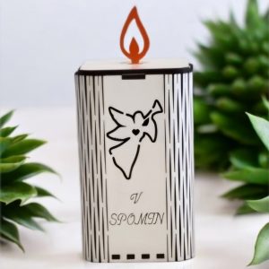 Oblika: Sveča je natančno izrezljana v obliko prave sveče s plamenom na vrhu, z nežnimi in tekočimi linijami, ki ponazarjajo spokojnost. V sredini je upodobljen ANGEL, ki je simbol upanja in ljubezni, kar še dodatno poudarja pomen spomina in spoštovanja.