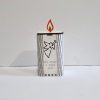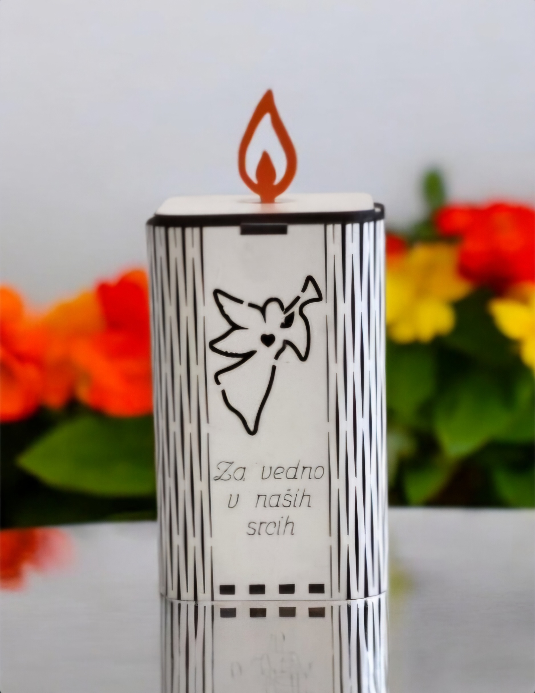Njena pravokotna oblika s čistimi linijami in diskretnimi rezi ustvarja sodoben, a hkrati klasičen videz, ki se lepo zlije z vsakim okoljem. Sprednjo, levo in desno stran sveče krasi izrez podobe ANGELA S TROBENTO, ki simbolizira mir in spokojnost. V kombinaciji z napisom “ZA VEDNO V NAŠIH SRCIH”, jo naredi idealno za obeležitev spomina na ljubljene osebe. Na vrhu sveče je dodan okrasni plamen v oranžni barvi, ki deluje kot simbol večnega plamena in daje sveči dodatno toplino in globino.
