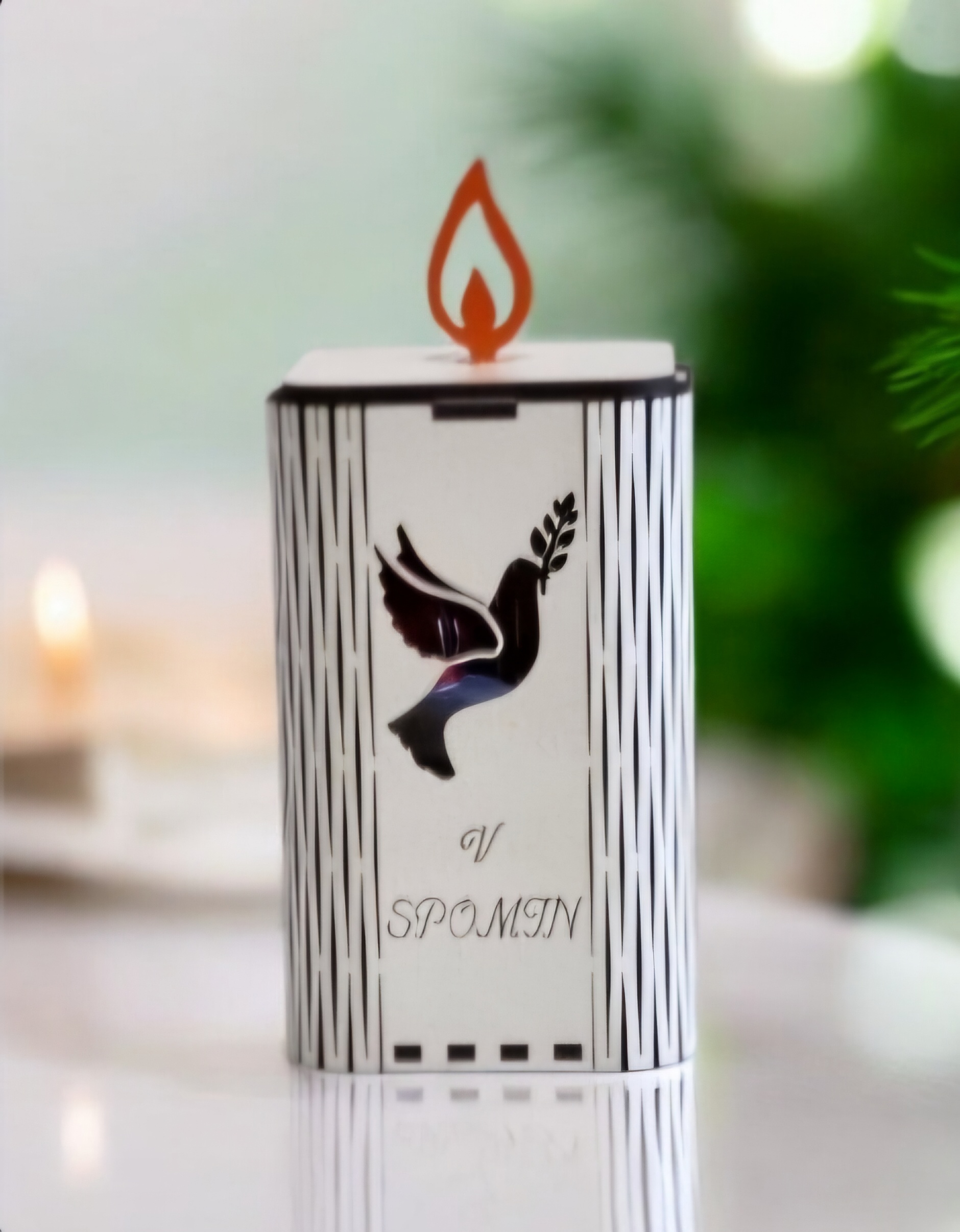 Njena pravokotna oblika s čistimi linijami in diskretnimi rezi ustvarja sodoben, a hkrati klasičen videz, ki se lepo zlije z vsakim okoljem. Sprednjo, levo in desno stran sveče krasi izrez podobe GOLOBA, ki simbolizira mir in spokojnost. V kombinaciji z napisom “V SPOMIN”, jo naredi idealno za obeležitev spomina na ljubljene osebe. Na vrhu sveče je dodan okrasni plamen v oranžni barvi, ki deluje kot simbol večnega plamena in daje sveči dodatno toplino in globino.