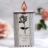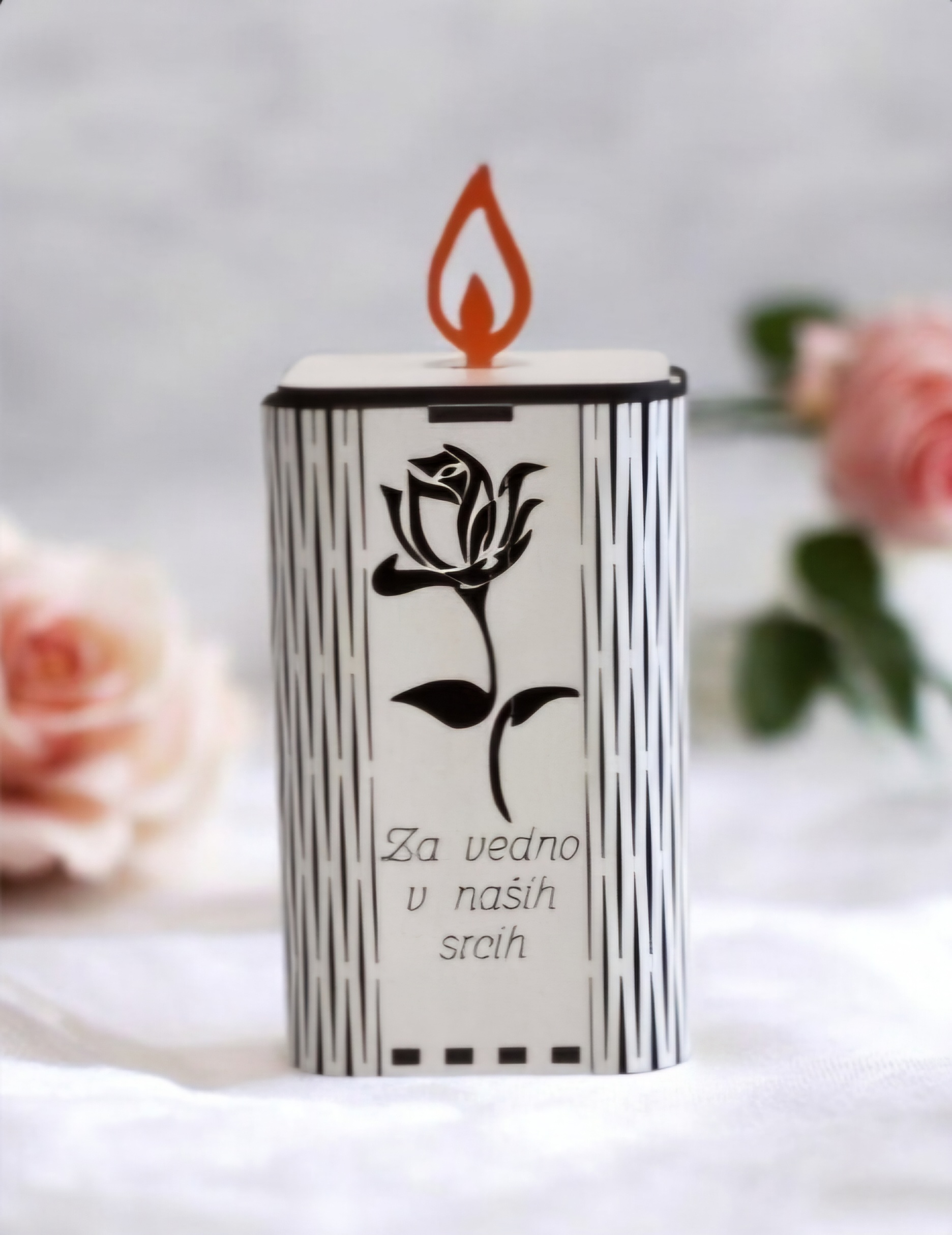Njena pravokotna oblika s čistimi linijami in diskretnimi rezi ustvarja sodoben, a hkrati klasičen videz, ki se lepo zlije z vsakim okoljem. Sprednjo, levo in desno stran sveče krasi izrez podobe VRTNICE, ki simbolizira mir in spokojnost. V kombinaciji z napisom “ZA VEDNO V NAŠIH SRCIH”, jo naredi idealno za obeležitev spomina na ljubljene osebe. Na vrhu sveče je dodan okrasni plamen v oranžni barvi, ki deluje kot simbol večnega plamena in daje sveči dodatno toplino in globino.
